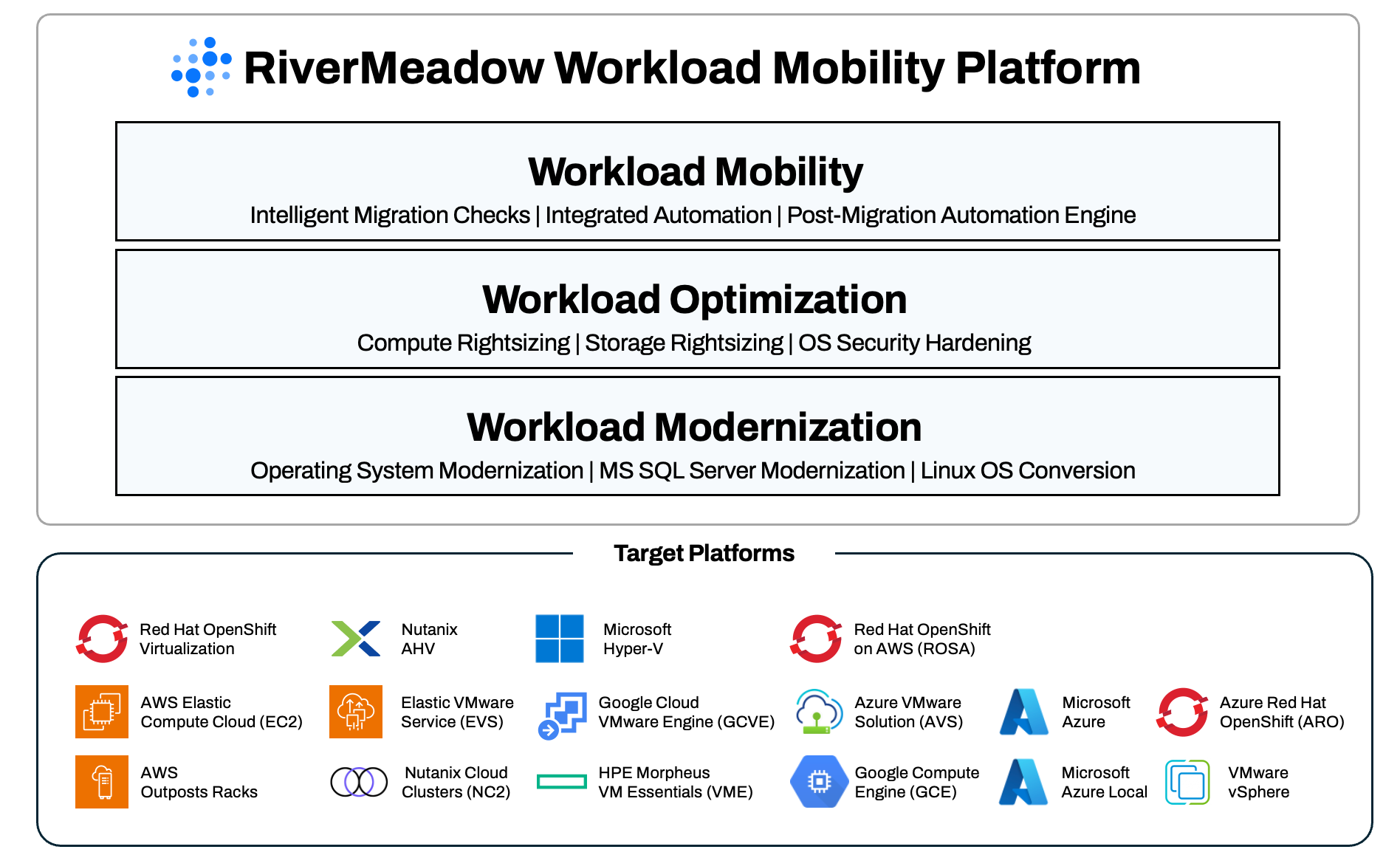 The RiverMeadow platform is a workload mobility solution that enables organizations to migrate, optimize, and modernize workloads (physical servers and virtual machines) from any source to over a dozen target platforms in the public cloud and on-premises.